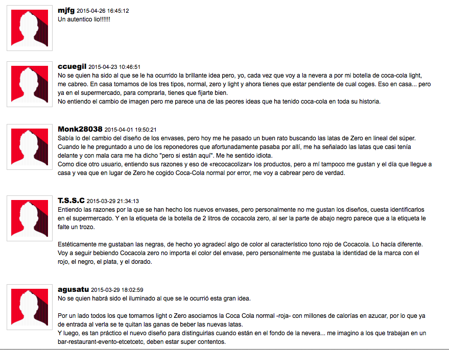 Lo cierto es que, en el corto plazo, no podemos decir que sea una maniobra aplaudida. Lo dicen los clientes. Lo que adjunto es un extracto del propio blog de la marca donde los consumidores expresan claramente su desacuerdo con la decisión, su dificultad a la hora de elegir su marca favorita en el supermercado y su queja por la pérdida de identidad. Algunos no lo viven como un cambio de peinado, sino como un cambio de sexo.