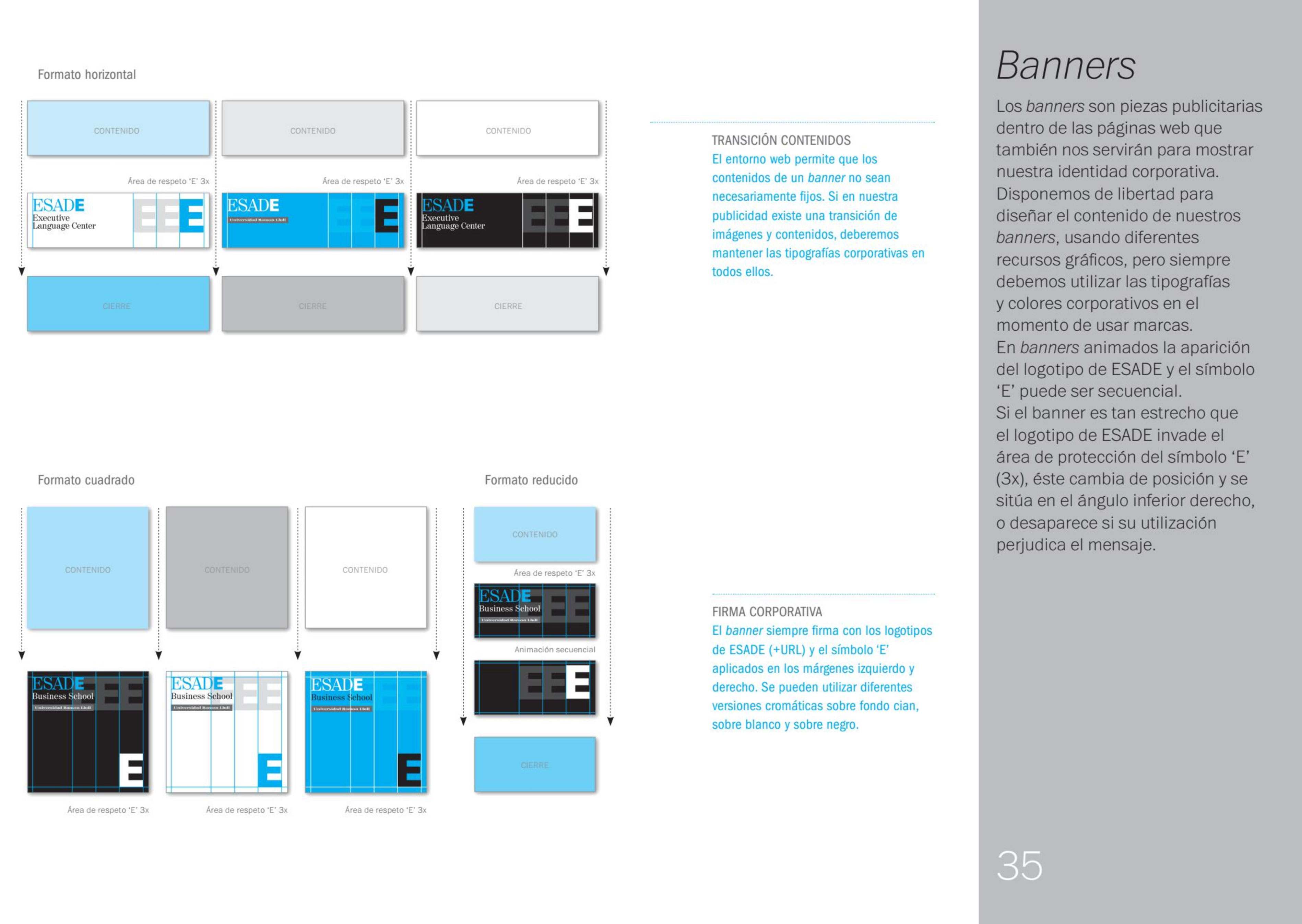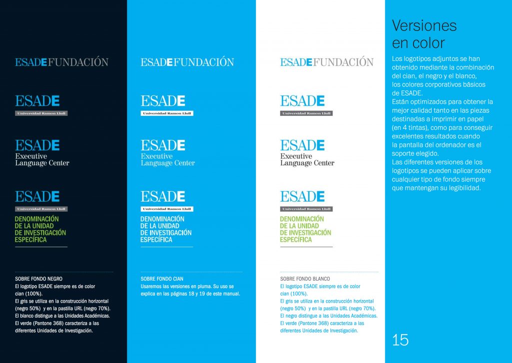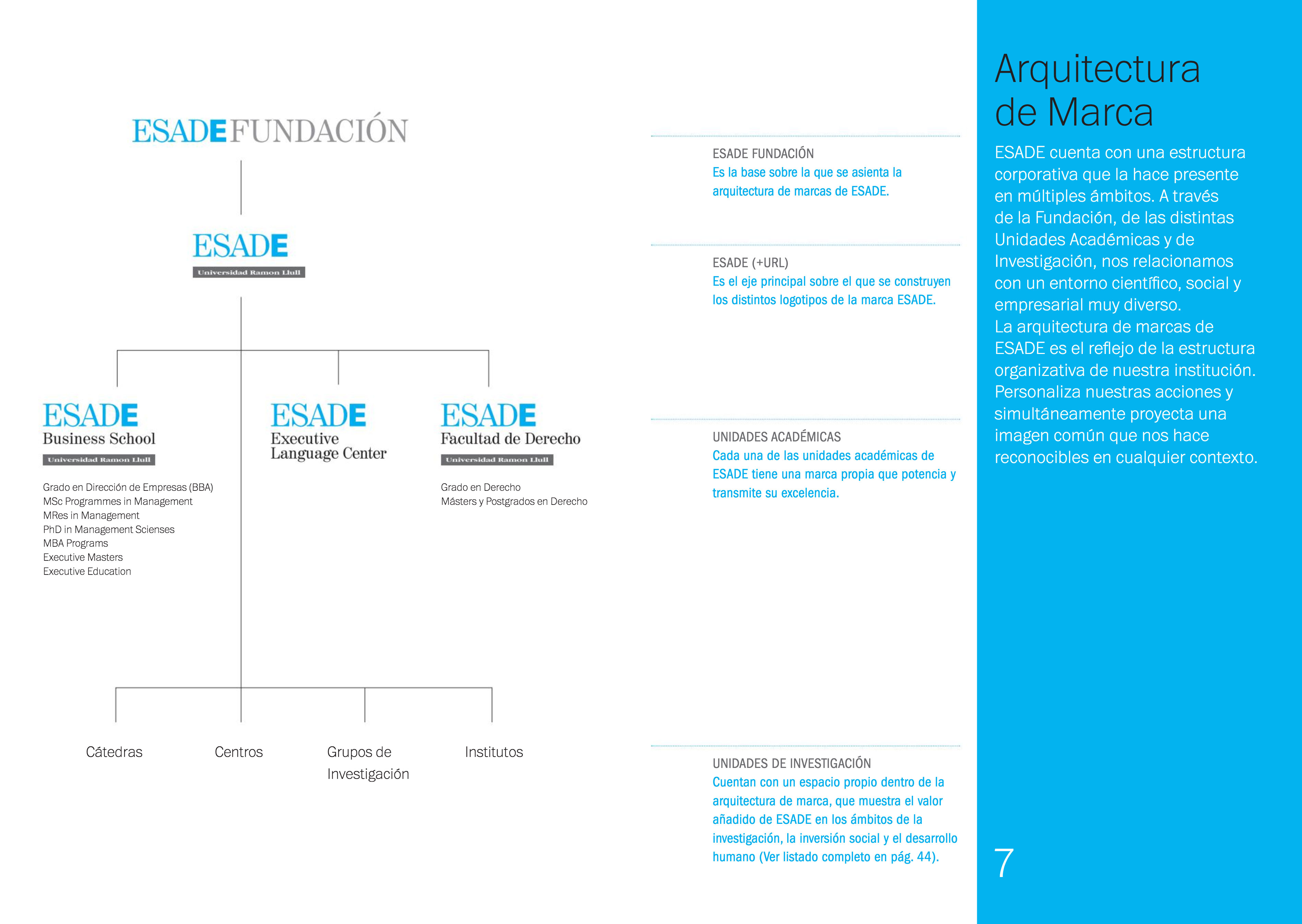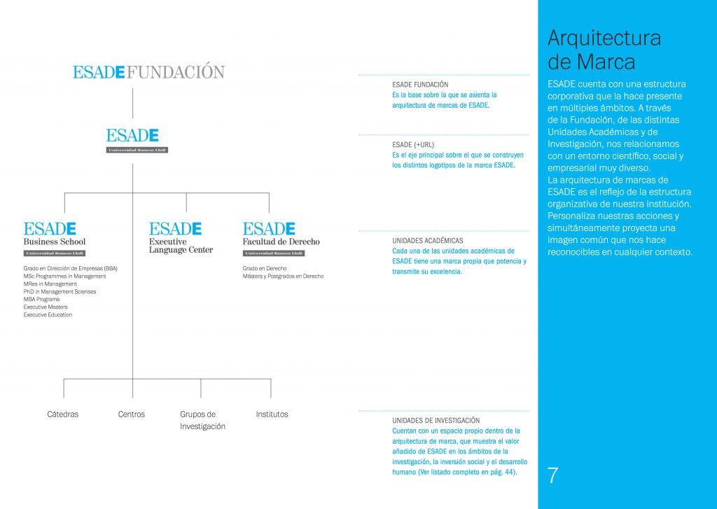 Un posicionamiento que se apoya sobre su teórica debilidad (la universidad) Posicionamiento: El único centro privado de enseñanza superior en España con dos áreas (Universidad y Business School) independientes pero sinérgicas y coherentes en su enfoque y valores y que se caracteriza por su carácter abierto y plural. Con una arquitectura de marcas que separa claramente las dos realidades Esade (universidad y Business School) para dotarlas del máximo posible de independencia. Un cambio de identidad que refuerza la idea institucional: el símbolo no es necesario.