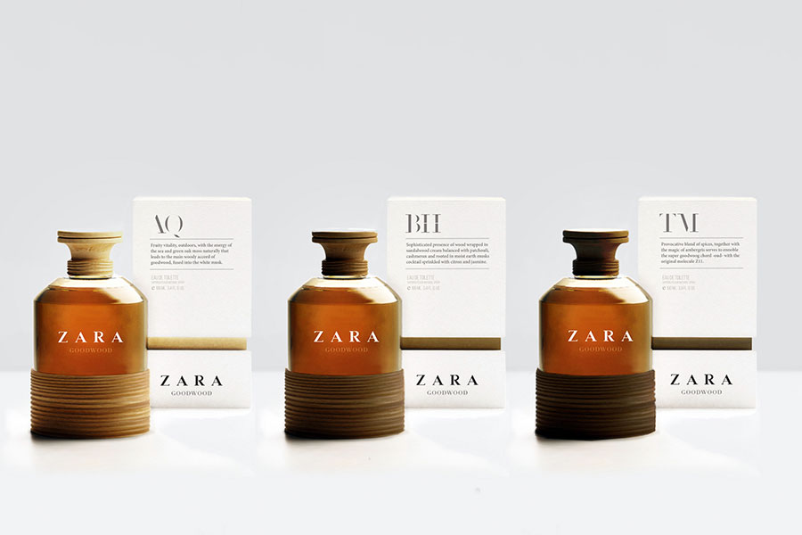 Zara Cosmetics. Desarrollo de línea masculina de la familia amaderada. Namings, diseño de packaging y gestión de las fragancias.